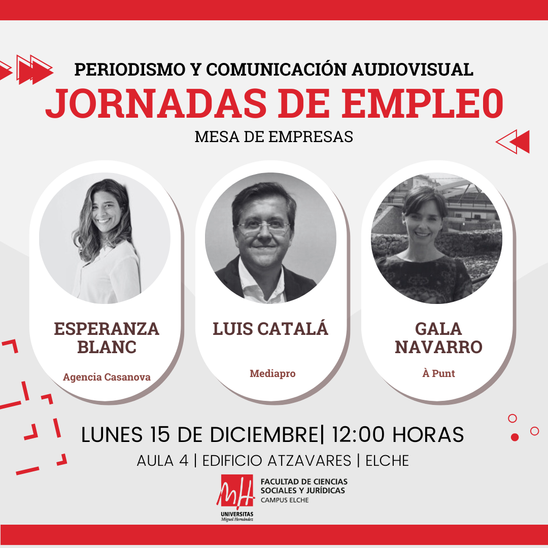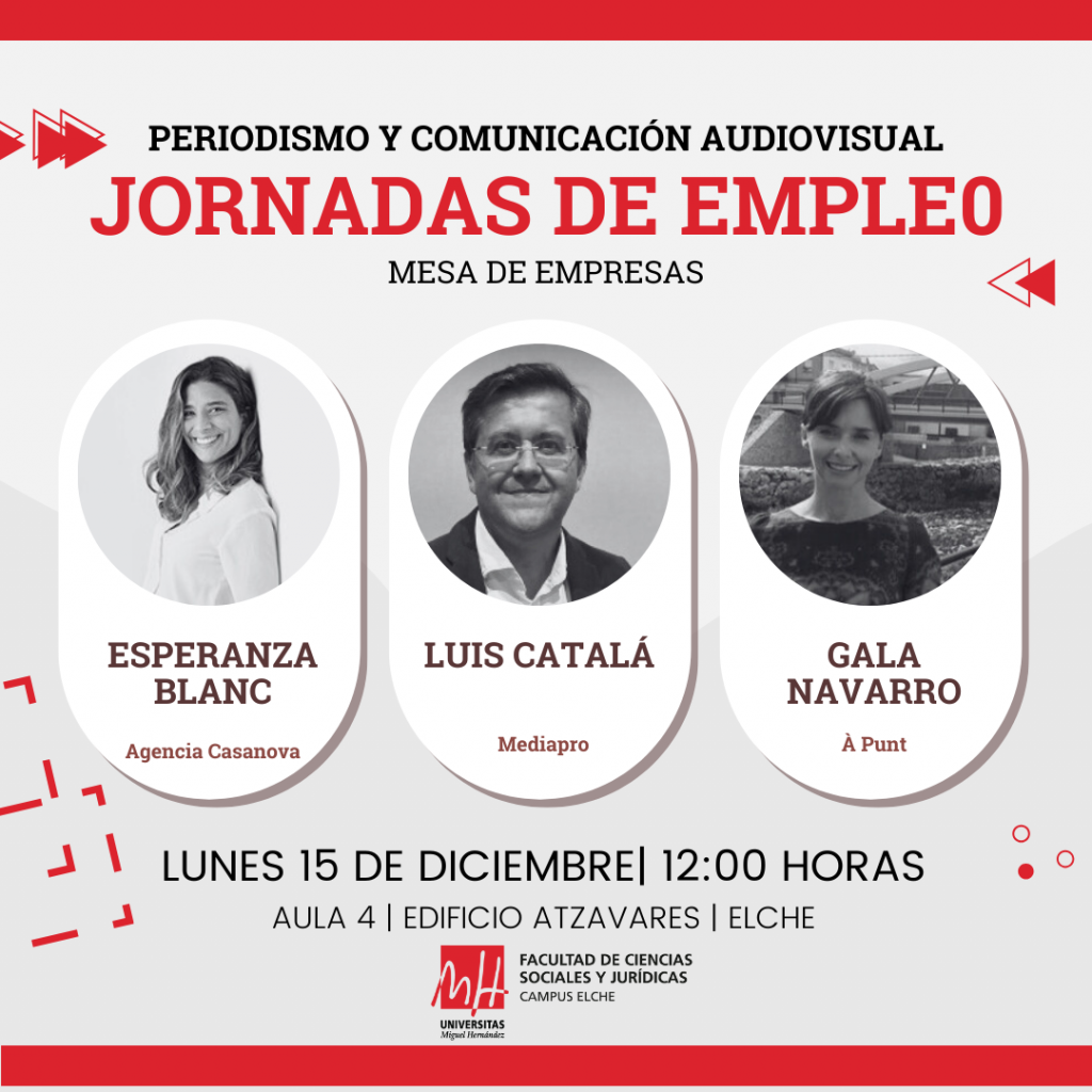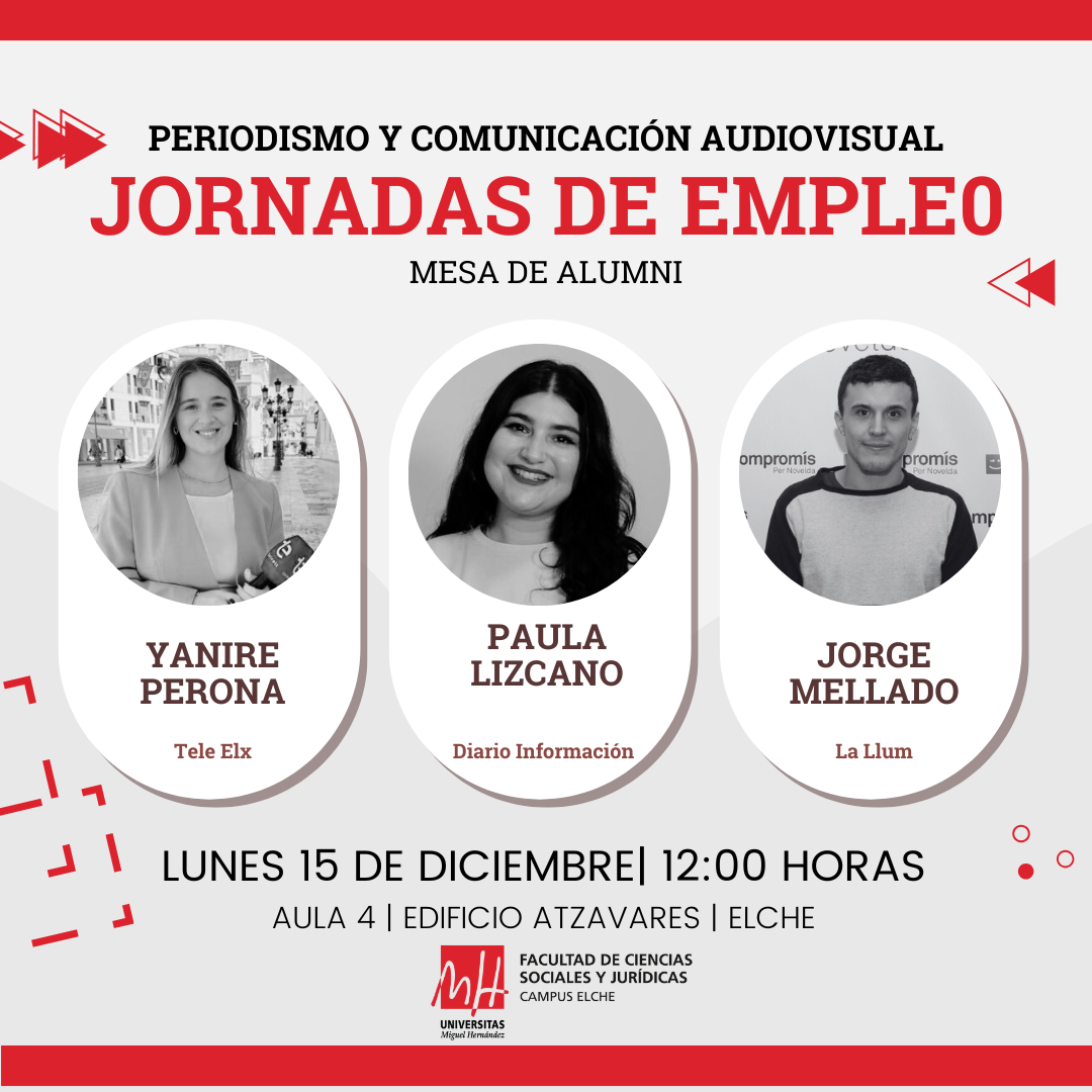 El próximo lunes 15 de diciembre, de 12:00 a 14:00 horas, se celebrará en el aula 4 del edificio Atzavares (campus de Elche) la XIX Jornada de Empleo dirigida al estudiantado de Periodismo, Comunicación Audiovisual y el Doble Grado en Comunicación Audiovisual y Periodismo. La actividad está organizada por la Facultad de Ciencias Sociales y Jurídicas de Elche y el Observatorio Ocupacional.