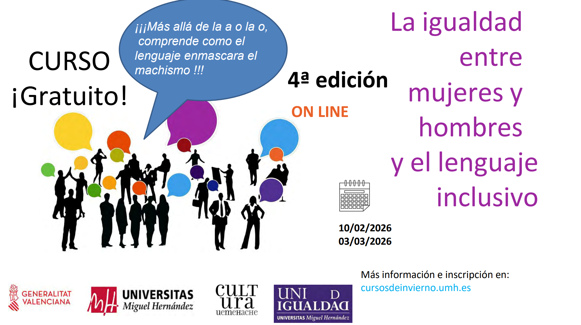 El Vicerrectorado de Cultura, Igualdad y Diversidad de la UMH, a través de la Unidad de Igualdad, organiza el curso gratuito de invierno Lenguaje inclusivo y comunicación, que se impartirá en modalidad online del 10 de febrero al 3 de marzo de 2026. Esta actividad cumple con las actividades del II Plan de Igualdad de la universidad.